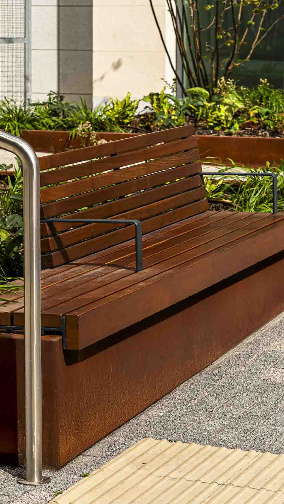The Corten steel develops a self-protecting rust patina over time, echoing the weathered textures of old Dublin while requiring virtually zero maintenance. The iroko hardwood slats provide a soft, warm touchpoint for guests, balancing the raw, industrial aesthetic of the metalwork. Microporous stain is applied to the wood, which enhances the natural colour and improves UV resistance.